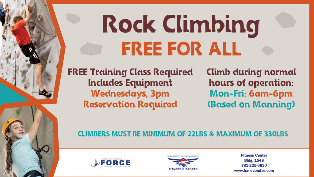 Rock Climbing is available from Monday through Friday 6 AM to 6 PM